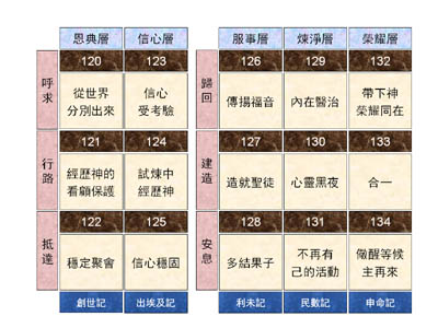 〈上行之诗〉显示神子民属灵长进的十五个阶段。十五篇诗可分成五组:恩典层、信心层、服事层、炼净层、荣耀层。这五组又可分别对应到《摩西五经》。本次先讨论恩典层的三篇:120-122篇,这相当于属灵学校的小学一到三年级。